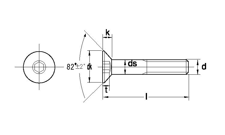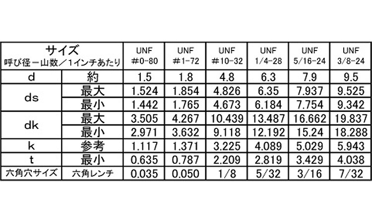 六角穴付皿ボルトのユニファイ規格(細目)に基づくインチねじであり、呼び径やピッチは1"(約25.4mm)で規定されます。ピッチは1インチあたりの山数で表されます。一部のサイズではウィット規格の雌ねじにも使用可能ですが、角度が異なるため厳密な互換性はありません。このボルトは円筒形の頭部に六角形の穴があり、締め付けには六角棒スパナ(六角レンチ)が使用されます。 通常、ナットと組み合わせずに使用されます。