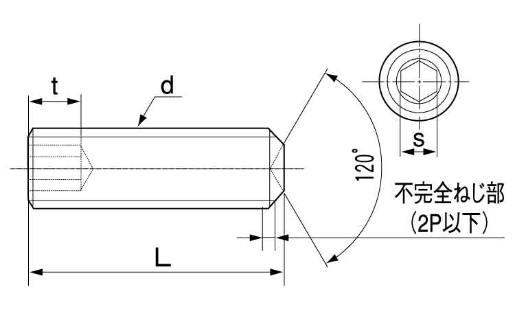 ホーローセット・いもねじとも呼ばれ、六角穴部分のレンチサイズは呼び径の半分です。