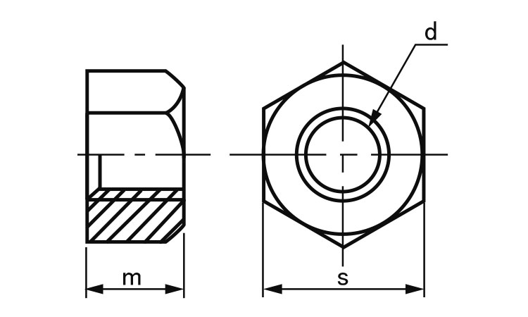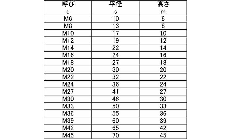 十割六角ナット(1種)は、「厚ナット」「10割ナット」「十割ナット」とも呼ばれる、ナット高さが呼び径と同等(10割)の六角ナットです。
